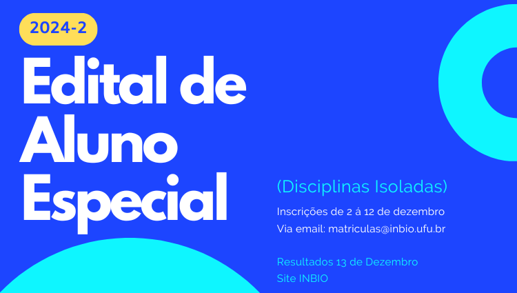 A Coordenação do Curso de Ciências Biológicas, do campus Umuarama da Universidade Federal de Uberlândia, faz saber aos alunos interessados que estão abertas as inscrições para a seleção de alunos especiais, para o 2º semestre letivo de 2024 (Início: 9/12/2024 - Término: 12/05/2025), para a matrícula em disciplinas isoladas.